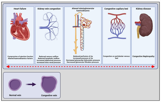 Heart failure and chronic kidney disease are commonly associated conditions, and congestive nephropathy should be suspected in patients clinically affected who show an improvement in renal function after decongestion therapies. From a hemodynamic point of view, the increase in central venous pressure (CVP) is directly transmitted to the renal venous system and, consequently, influences the glomerular filtration rate (GFR) [7,8,9]. The renal filtration pressure (FP) (from which the hydrostatic pressure of the glomerular capillary comes) depends on the renal perfusion pressure (RPP) and the renal blood flow (RBF). In turn, RPP depends on mean arterial pressure (MAP) and renal venous pressure (RVP), the RBF of renal arterial pressure (RAP), RVP, and intrarenal vascular resistance (IVR) [4]. Of interest, an increase in CVP may be prevented by a compensatory increase in renal lymphatic flow, however, the continuing elevation of CVP will progressively reduce venous and lymphatic outflow and late-stage arterial inflow [10].