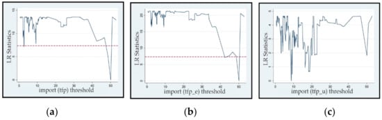 Likelihood ratio (LR) function graph of the import threshold variables: (a) green TFP (tfp), (b) energy conservation effect (tfp_e), and (c) environmental improvement effect (tfp_u).