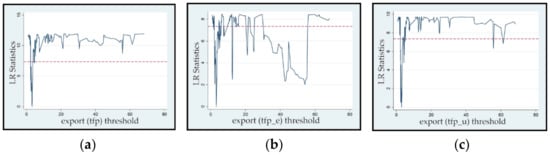 LR function graph of export threshold variables: (a) tfp, (b) tfp_e, and (c) tfp_u.