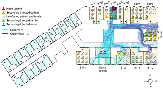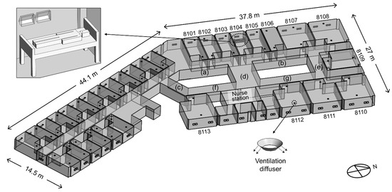 - Jo, S.; Hong, J.; Lee, S.-E.; Ki, M.; Choi, B.Y.; Sung, M. Airflow analysis of Pyeongtaek St Mary’s Hospital during hospitalization of the first Middle East respiratory syndrome patient in Korea. R. Soc. Open Sci. 2019, 6, 181164. [Google Scholar] [CrossRef] [Green Version]