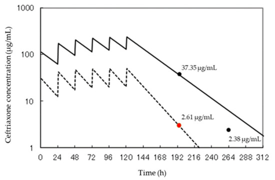- Patel, I.H.; Sugihara, J.G.; Weinfeld, R.E.; Wong, E.G.; Siemsen, A.W.; Berman, S.J. Ceftriaxone Pharmacokinetics in Patients with Various Degrees of Renal Impairment. Antimicrob. Agents Chemother. 1984, 25, 438–442. [Google Scholar] [CrossRef]