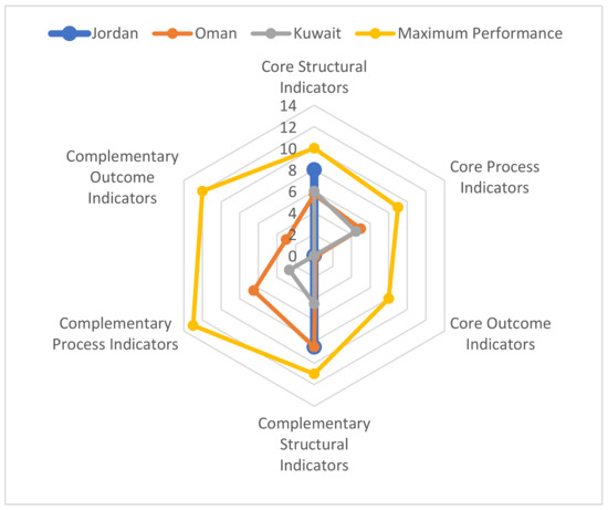 The three countries’ PV systems were evaluated for the 63 WHO PV indicators which contain 27 “core” and 36 “complementary” indicators. The PV systems of Jordan, Oman, and Kuwait achieved aggregate scores of 8, 11, and 11, respectively, for the “core” indicators and 9, 18, and 7, respectively, for the “complementary” indicators. The “process” and “outcome” indicators for Jordan which were not supplied were scored as 0. A complete breakdown of the total scores according to each group of indicators is provided as a visual representation in Figure 1. In what follows, the study findings for the three study countries are presented in two sections, namely, WHO “Core Indicators” and “Complementary Indicators” [15].