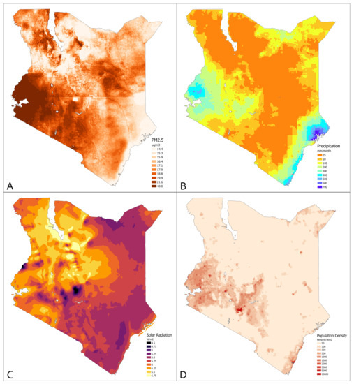 Assessing links between air pollution and health is complicated by the difficulty of properly measuring air pollution exposures. Exposure monitors are one way of assessing ambient exposures, but these are limited by the number and placement. The gridded dataset used for this study is built on satellite-based retrieval of aerosol optical depth and output from a chemical transport model (CTM). Ground-based monitors are used to understand factors that drive large-scale bias in satellite- and CTM-based estimates. The information they provide are interpreted in a way that can be applied over a large area. In the case of Kenya, only a handful of candidate monitors were available for use in the calibration for this model [93], but the predictions from the model itself are not simply locally determined. Full descriptions of the methodology used to produce the PM rasters are available in the literature [54,55]. A limitation, however, is the inability of the exposure raster to adequately capture localized processes which contribute to ambient PM levels, such as the burning of biomass fuels for cooking and/or heating. It has been suggested that grass-roots-level data collection is required to adequately assess associations between exposure and outcomes between, for example, rural and urban areas or even within urban areas themselves [94].