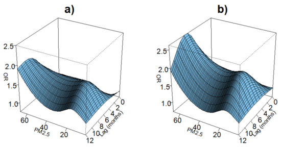 Three-dimensional plots of lag associations up to cumulative 12 months of PM exposure with odds ratios of symptoms of ARI. Plot (a) is of a model that includes only the crossbasis for PM. Plot (b) is of the same model but with the additional crossbasis of precipitation and confounders for sex, age, distance to lake, and type of cooking fuel used.