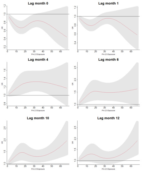 Lag-specific odds ratios of ARI with up to cumulative 12 months of exposure to PM, including confounders for sex, age, distance from nearest lake, type of cooking fuel, and crossbassis for precipitation in the model.