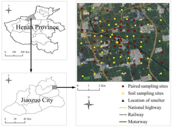 The study area (around Dongfang Gold Lead Co., Ltd.: Jiaozuo, China) was located in the northwest of Henan province (Jiaozuo city), Huanghuai Plain, China (33°19′17.61″ N, 113°02.17″ E) (Figure 1). The climate of Jiaozuo City is a typical continental monsoon climate with four clearly distinct seasons. The annual average temperature and the annual precipitation are 14.9 °C and 603.5 mm. The soil in the study area was classified as Luvisol [25]. Jiaozuo is rich in mineral resources, including coal, bauxite, and pyrite. Sufficient energy supply promoted the rapid development of the nonferrous smelting industry, such as Pb/Zn smelter and aluminum smelting. Dongfang Gold Lead Co., Ltd. is one of the Pb/Zn smelting enterprises established in 2003; their main products are electrolytic lead, silver, gold, zinc oxide, copper, and other nonferrous metals. Due to inadequate environmental management, the company discharged a large amount of pollutants into the surrounding environment and was closed by the local government in 2014. After that, wheat and other crops were planted very close to the smelter by local farmers.