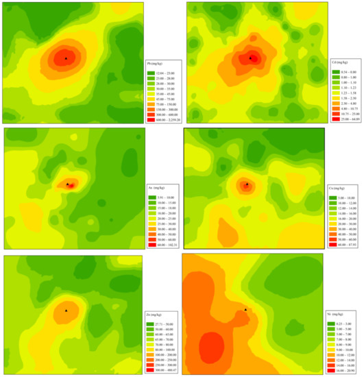 The spatial distribution of these metal(loid)s in soil is shown in Figure 2. The distribution of Pb, Cd, As, and Zn are similar, and their contents decreased gradually with the increase of the distance far from the smelter. Field research indicated that there was no sewage irrigation and inappropriate disposal of the smelting solid waste in the study area in the past. Therefore, atmospheric deposition may be attributed to the main source for Pb, Cd, As, and Zn contamination in the soil near the smelter. In addition, the distribution of Pb, Cd, As, and Zn in the study area is oval from northeast to southwest, which is consistent with the local dominant wind direction (southwest wind) [41,42].