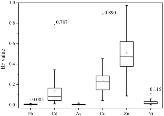 The BF values of these metal(loid)s ranged from 0.001 to 0.050 for Pb, 0.010 to 0.787 for Cd, 0.006 to 0.022 for As, 0.239 to 0.890 for Cu, 0.507 to 0.973 for Zn, and 0.024 to 0.115 for Ni, respectively, with the average BF value decreased in the following order: Zn > Cu > Cd > Ni > Pb > As (Figure 3). Due to the high toxicity of Cd, most of the previous reports emphasized that Cd can be accumulated in wheat grain easier than other metals [17,30], and just a few attentions paid to the BF value of Cu and Zn in wheat.