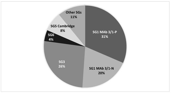 2.8. Assessing the Association between Age of Culture-Positive Cases and Infection with MAb 3/1 Positive Strains vs. MAb 3/1 Negative and Non-SG1 Strains