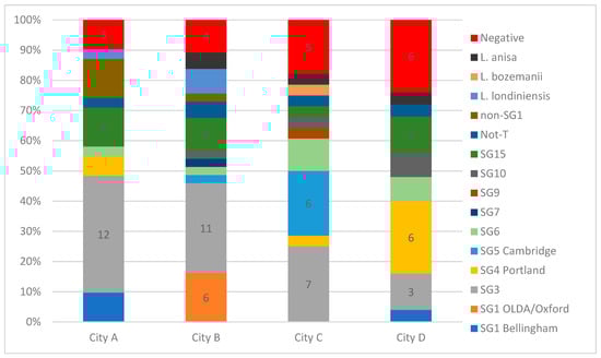 Altogether, 11 different LP sero/subgroups were identified among 103 isolates from the DHW samples. In Figure 2, the relative proportions of Legionella species and LP sero/subgroups detected (and systems with no growth) are presented. In general, one to two colonies from each culture positive DHW system were identified down to species and sero/subgroup (Figure 2). LP SG1 of the MAb 3/1-P group was not identified in any of the systems (Figure 2). SG1 MAb 3/1-N was only isolated from 10 systems (9.6%) among cities A, B, and D (0% in City C, 4% in City D, 12.5% in City A, and 20% in City B). The LP sero/subgroup distribution varied greatly, with samples from each city revealing a unique composition (Figure 2).