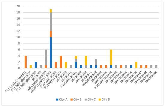 Altogether, 26 different STs were identified among the 73 investigated LP isolates from the DHW systems and 80.8% of the STs were detected in one City only (21/26). The diversity of STs (and associated sero/subgroups) per system for each city is shown in Figure 3 (70 systems in total). ST87 was the only ST detected in all four cities and was most prevalent in City A (53% of isolates with known ST) (Figure 3). SG1 ST1 was only isolated in City B. ST80 (SG5 Cambridge) and ST1333 (SG4/SG10) were the second most commonly isolated ST, each being isolated from six samples.