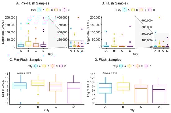 The mean concentration of Legionella in the Pre-flush samples was approximately two to nine times greater than the flush samples from the study cities. City C had the highest mean concentration of Legionella in the Pre-flush samples (56,144 SD: 198,643), which decreased to a mean of 6860 in the Flush samples; however, due to the large variance in sample concentrations, the greatest median concentration of Legionella among Pre-flush samples belonged to City B (Table 3 and Figure 4). 53% of Pre-flush samples in City B measured greater than 10,000 CFU/L of Legionella (Table 4). City B also measured the highest median concentration for Flush samples of 2150 CFU/L, with 33% of Flush samples having a concentration of Legionella > 10,000 CFU/L (Table 3 and Table 4). The mean of Pre-flush and Flush samples (log of CFU/L) did not differ significantly by city (ANOVA p > 0.05) (Figure 4).