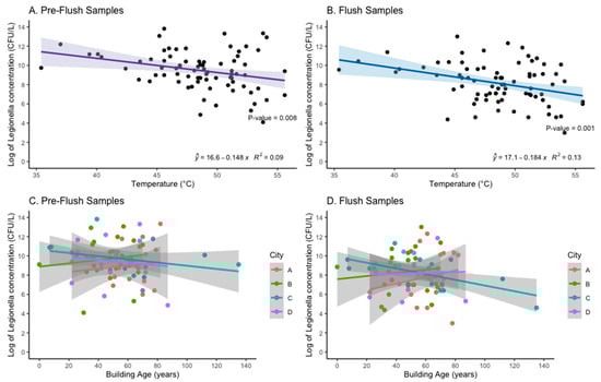 This study found relatively high concentrations of LP in the hot water systems, regardless of sero/subgroup. The only building characteristic that was significantly associated with an increase in Legionella concentration from either Pre-flush and Flush samples was temperature at the tap, and this was primarily driven by samples from City B and City D (Supplementary, Figure S2). Interestingly, City A was the only city to have an association between increasing building age and an increasing concentration of Legionella in both the Pre-flush and Flush samples (Figure 5). City A had the greatest mean building age compared to the other cities sampled in this study (Table 3). Other studies have shown an association with system/building age and risk of colonization []. For City A, no renovation was recorded, but for City C and D several buildings were renovated recently, and this might contribute to the weak or inverse association between building age and concentration (CFU/L) for those cities (Figure 5). Multiple physical, chemical, and biological factors are known to influence the growth of Legionella in hot water systems, but this study was limited to assessing only readily accessible building characteristics.