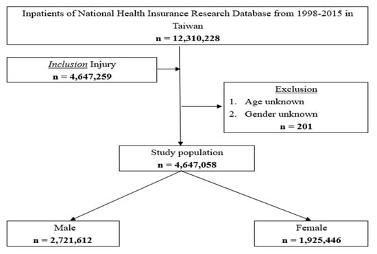 To date, research on the relationship between gender and injury remains limited. Such research also has limitations, including small sample sizes, insufficient tracking time, physical and mental illnesses that are not controlled, and unexplored gender differences in injuries. Therefore, this study assumes that gender differences are related to injuries. Data on injured male and female patients from 1998 to 2015 were collected from the National Health Insurance Research Database (NHIRD) of Taiwan for a long-term follow-up analysis of the epidemiological characteristics of gender differences in relation to injury.