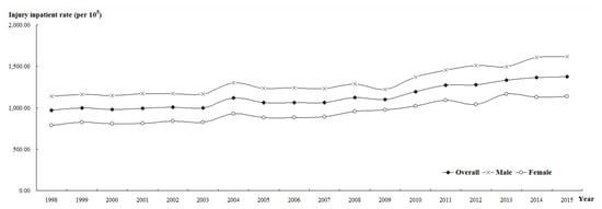 Trends in hospitalization rates for injuries in Taiwan from 1998 to 2015.