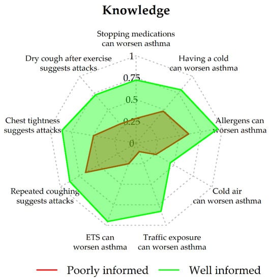 - Silva, C.M.; Barros, L. Asthma Knowledge, Subjective Assessment of Severity and Symptom Perception in Parents of Children with Asthma. J. Asthma 2013, 50, 1002–1009. [Google Scholar] [CrossRef]
