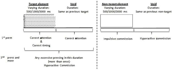 Distractors are presented for 8 s, with a fixed interval of 0.5 s between two distractors. Participants are requested to respond to the target stimuli as fast as possible by pressing the space bar only once, and avoid responding to non-target stimuli. Three types of distractions are presented: (a) visual distractors (e.g., animated barking dog); (b) auditory distractors (e.g., barking sound); and (c) a combination of both (e.g., animated barking dog with the sound of barking). Visual distractors appear at one of four spatial locations on the sides of the screen: down, up, left, or right. Overall, eight different distractors were included, and each of them could appear as purely visual, purely auditory, or as a combination of them. The MOXO-CPT provides four indexes: (a) Attention—the number of correct responses to targets not bound by any time frame (max. score 272); (b) Timing—the number of correct responses only while targets are presented (max. score 272); (c) Impulsivity—the number of impulsive responses to non-target stimuli; and (d) Hyperactivity—the remaining commission errors not counted as impulsivity (for example, multiple spacebar presses or random key pressing) (Figure 1).