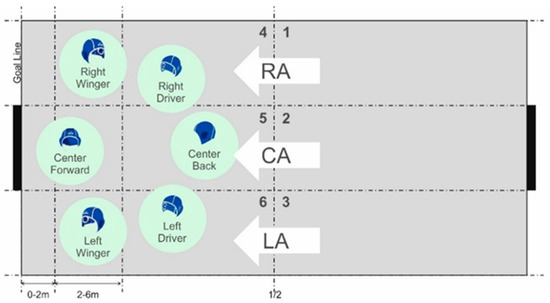 Notational analysis was performed by one expert (the first author) watching FINA tv™ matches and using specific tactical-technical variables. Tournament scores and official game reports (start list, play by play and results) were also considered to check data, if necessary, with the intra-observer reliability achieving Kappa Index ≥ 0.91. A field of play scheme, adapted from previous studies [9,11,23], was used as an observational support instrument (Figure 1).