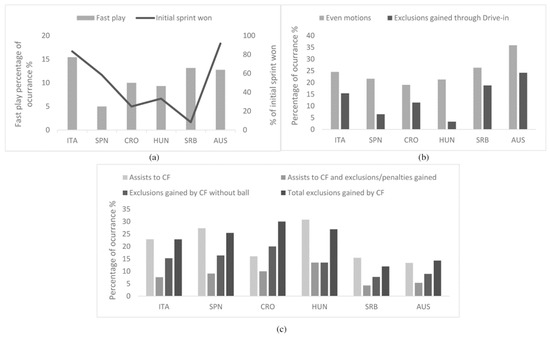 Teams’ main offensive methods and behaviours up to and during the positional even play: (a) fast plays and initial sprints won; (b) actions in even play and consequent drive-in exclusions gained; (c) assists to center forward and exclusions gained with or without ball. CF – center forward player; ITA—Italy; SPN—Spain; CRO—Croatia; HUN—Hungary; SRB—Serbia; AUS—Australia.