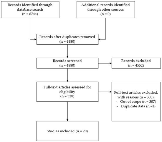 We identified 6744 studies and, after eliminating 1864 duplicates, we examined 4880 studies. Based on the above inclusion criteria, we selected 328 studies that were considered eligible. We excluded 308 studies because the objective and perceived measures of the environment were used to investigate different characteristics. One article [59] was excluded because it shows the survey result also reported in a more recent article [60] (see Figure 1). Table 1 and Table 2 show the 20 studies included in this review and their characteristics.
