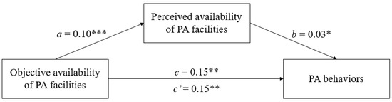 There were no empty cells in the pooled correlation matrix (Table 4). For all studies, correlation between environmental measures and PA were available in the original article or were furnished by the authors (J.D. Mackenbach, personal communication, 7 January 2021). Table 2 shows the pooled correlation matrix computed in the first stage of analysis and used in the second stage. The Q statistic was significant (Q(9) = 69.662, p < 0.001), indicating that the five correlation matrices were heterogeneous and justifying the random effect method. Figure 2 shows the path diagram of the model fitted in the second stage. The objective availability of PA facilities significantly predicted the perceived measure (β = 0.10, p < 0.001) and PA behavior (β = 0.15, p < 0.01). Perceived availability of PA facilities also significantly predicted PA behaviors, but its effect was negligible (β = 0.03, p < 0.05). The Sobel test demonstrated that the mediation effect was significant (β = 0.003, p < 0.05) but negligible. Indeed, c’ was significant and had the same size as c.