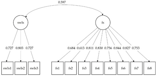 The one-factor demonstrated a bad fit of (χ2(44) = 504.655, p < 0.001), the other fit indicators indicated that the model does not fit the data, given that CFI = 0.877, TLI = 0.846, RMSEA = 0.093 (90% CI for RMSEA = [0.085, 0.010]) and SRMR = 0.074. Although χ2 is statistically significant (χ2(43) = 130.558, p < 0.001), the other fit indicators indicate that the two-factor model fits the data very well, i.e., CFI = 0.977, TLI = 0.970, RMSEA = 0.041 (90% CI for RMSEA = [0.033, 0.049]) and SRMR = 0.032. All factor loadings in this model were statistically significant, with the standardized values ranging from 0.613 to 0.844 (p < 0.001 all of them) (see Figure 1). For the three-item SWLS version, the values for the CR and the AVE were 0.797 and 0.567, respectively. For the FS, the values for the CR and the AVE were 0.929 and 0.624, respectively. The correlation between the latent variables was 0.597 (p < 0.001), which also offers good evidence of convergent validity.