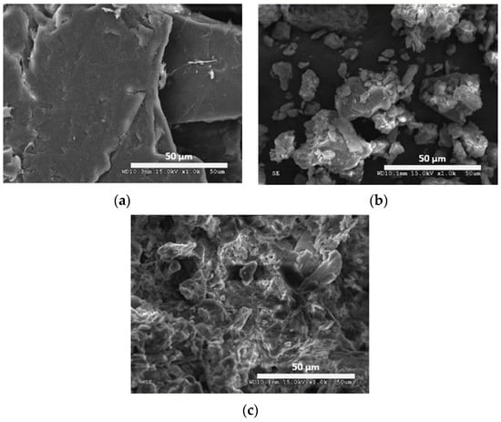 SEM micrographs of (a) chitosan, (b) bentonite, and (c) CCB.