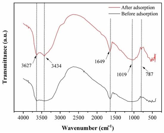 The FT-IR spectra of raw CCB and CCB loaded with Pb(II) are shown in Figure 2. The following peaks are attributed to chitosan: 3434 cm−1 due to stretching of N-H and O-H groups and 1649 cm−1 due to amide I bands and C=O stretching of acetyl units [34,58]. Bentonite is represented by the following peaks: 787 cm−1 due to vibrations of Mg-OH and Al-OH, 1019 cm−1 due to stretching of Si-O groups, 1649 cm−1 due to O-H bending vibration, and 3434–3627 cm−1 due to O-H stretching vibrations [34,59,60]. After adsorption, the peaks at 3627 cm−1 and 3434 cm−1 become sharper, which implies interaction between CCB and Pb(II) via the O-H groups of bentonite [61].