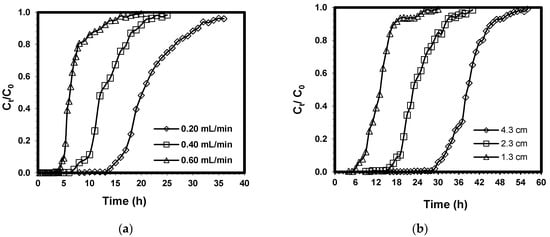Figure 3a illustrates the breakthrough curves of Pb(II) under varying flow rates. The results show that breakthrough and exhaustion occurred earlier when the flow rate was increased from 0.20 mL/min to 0.60 mL/min. The breakthrough curves were observed to shift from left to right with a decrease in flow rate. At higher flow rates, breakthrough curves were observed to become steeper. Table 1 shows column parameters such as adsorption capacity at exhaustion (qe), adsorption capacity at breakthrough (qb), and length of MTZ (Zm). An increase in the value of qb and qe was observed as the flow rate was decreased from 0.60 to 0.20 mL/min. Meanwhile, low values of Zm were observed under low flow rate, indicating a decreasing length of MTZ. This means that low flow rate would cause a longer time for breakthrough and exhaustion in the fixed bed to occur due to an extended contact time for adsorption to take place since the MTZ movement along the fixed bed would be slower [62]. On the other hand, high values of flow rate mean limited time for diffusion of Pb(II) from the solute onto the binding sites located on the CCB surface and its pores, which would result in low values of qb and qe.