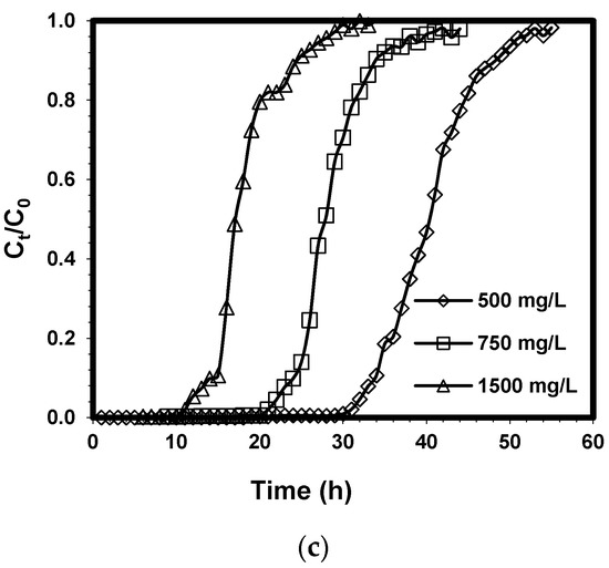 Figure 3c illustrates the breakthrough curves of Pb(II) under different initial concentrations with constant flow rate and bed height of 0.20 mL/min and 4.3 cm, respectively. The time to reach breakthrough and exhaustion was observed to decrease as the initial concentration was increased from 500 to 1500 mg/L. At low initial concentrations, the breakthrough curves became more dispersed and the time to reach breakthrough was longer. When the initial concentration was increased to 1500 mg/L, the breakthrough curves became steeper, which indicates quick saturation of the fixed bed.