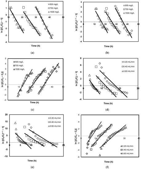 Under different initial concentrations and flow rates, Figure 4b,d demonstrate the experimental data fitted with linear plots generated by the Clark model while Figure 4c,f show the fitting of the Yoon–Nelson model with experimental data. Based on Table 2 and Table 3, the results show that lower R2 values were obtained for both the Clark model (0.6791 ≥ R2 ≥ 0.9228) and the Yoon–Nelson model (0.7407 ≥ R2 ≥ 0.9380). This indicates that the Clark and Yoon–Nelson models cannot adequately describe the breakthrough curves. In comparison to the Thomas model, the results also show that the linear plots derived from the Clark model and the Yoon–Nelson model are not in good correlation with the experimental data.
