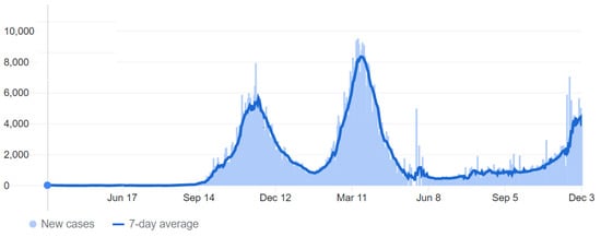 Coronavirus Disease 2019 (COVID-19) daily and weekly new confirmed cases in Jordan over 2020–2021. The first case was confirmed on 2 March 2020; the first peak was around November 2020, and the second one was around April 2020. The figure was adapted from COVID-19 Dashboard by the Center for Systems Science and Engineering (CSSE) at Johns Hopkins University (JHU) [,].