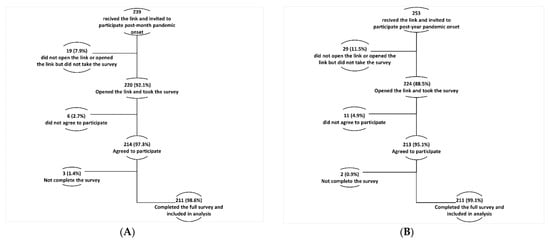 (A) Study participants flow chart post-month of COVID-19 pandemic onset. (B) Study participants flow chart after one year of COVID-19 pandemic.