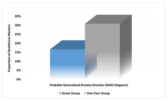 Using binary logistic regression, female gender was a significant risk factor for developing GAD in the onset group only. This finding is concordant with previous studies that indicated that females in general and female HCWs have a higher risk and more severe degrees of anxiety than males [,,,]. This could be attributed to the higher stress experienced by female HCWs at the onset of the pandemic []. This stress includes the added role of female HCWs in caring for their homes and children in addition to their work responsibilities, the higher worry women have about their health and the health of their families, and their higher sensitivity towards a new health crisis [,,]. These factors were maximal at the onset of such unpredictable and non-previously experienced stress and likely eased up with time [].