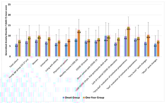 However, unlike the onset group, more participants’ characteristics were significantly associated with anxiety scores and symptoms in the one-year group. For occupation, physicians in the one-year group had significantly higher scores of anxiety (8.37 (5.43)) than other HCWs (5.45 (3.54)) (p = 0.004), as well as physicians in the onset group (6.36 (4.20)) (p < 0.001). Moreover, unlike the onset group, physicians in the one-year group experienced significantly more severe anxiety symptoms, based on anxiety categories, than other HCWs (p = 0.004). In addition, unlike the onset group participants, data from the one-year sample indicated that participants who perceived more remarkable changes in work schedule and intensity due to the pandemic had a more significant burden of anxiety symptoms (p < 0.001). As shown in Figure 4, the one-year group reported significantly higher GAD-7 scores than the onset group among the vast majority of socio-demographic and occupational characteristics of participants.