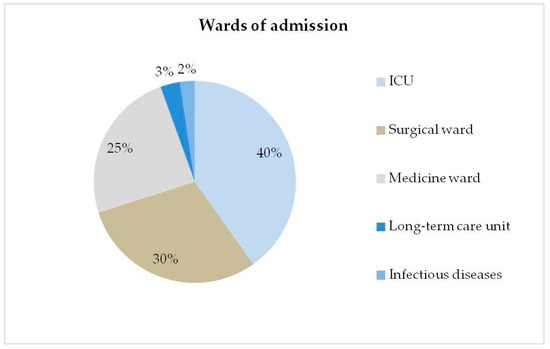 Patients were frequently admitted to the ICU (51/127; 40.2%), surgical wards (38/127; 29.9%), internal medicine wards (31/127; 24.4%), long-term care wards (4/127; 3.2%), and the infectious diseases ward (3/127; 2.4%) (Figure 1). Median (IQR) length of hospital stay was 46 (29–68) days.