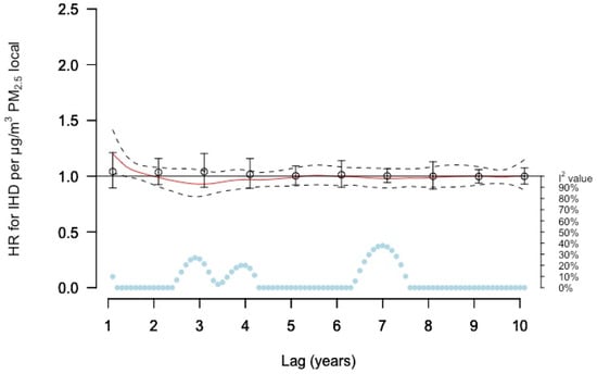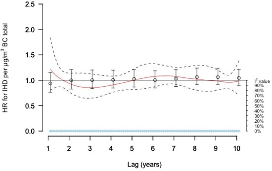 Meta-estimate hazard ratios (HRs), for the association between BC total and IHD, using: (1) Distributed lag non-linear model (DLNM) with penalized splines and 10 degrees of freedom within each cohort, where the red curve represents the meta-estimate HRs and black dashed lines the corresponding confidence intervals, and (2) Separate year specific (single lag) HRs represented as point estimates and confidence intervals in black. The light blue dots represent the heterogeneity of the cohort estimates at different lag times, with I2 values on the right axis.