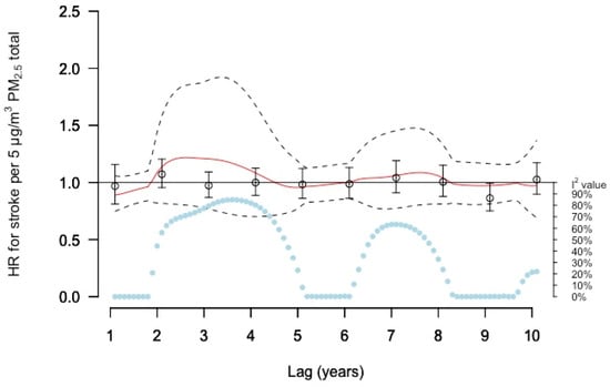 Meta-estimate hazard ratios (HRs), for the association between PM2.5 local and stroke, using: (1) distributed lag non-linear model (DLNM) with penalized splines and 10 degrees of freedom within each cohort except for MDC with 11 degrees of freedom where the red curve represents the meta-estimate HRs and black dashed lines the corresponding confidence intervals, and (2) Separate year specific (single lag) HRs represented as point estimates and confidence intervals in black. The light blue dots represent the heterogeneity of the cohort estimates at different lag times, with I2 values on the right axis.