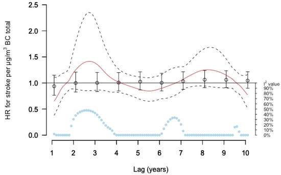 Meta-estimate hazard ratios (HRs), for the association between BC total and stroke, using: (1) distributed lag non-linear model (DLNM) with penalized splines and splines and 10 degrees of freedom within each cohort except for MDC with 11 degrees of freedom, where the red curve represents the meta-estimate (HR) and black dashed lines the corresponding confidence intervals (2) Separate year specific (single lag) HRs represented as point estimates and confidence intervals in black. The light blue dots represent the heterogeneity of the cohort estimates at different lag times, with I2 values on the right axis.