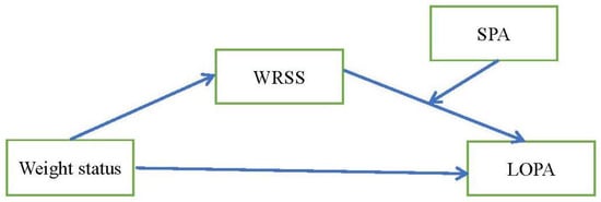 Although smartphones may be used to encourage people to engage in PA, SPA may directly or indirectly decrease PA in college students []. SPA may increase the likelihood of sedentary behaviors and consequently reduce the quality or quantity of moderate to vigorous PA []. PA may be a significant negative predictor of SPA among university students []. SPA may be closely associated with low degrees of motivation for doing PA and actual engagement []. Together, these findings suggest that although there are likely relationships between weight-related self-stigma (WRSS) and PA in female college students, SPA may influence this relationship, although this possibility has not been directly examined. Therefore, the possible moderating effects of SPA on this proposed relationship should be directly examined to find better solutions to increase PA in female college students.