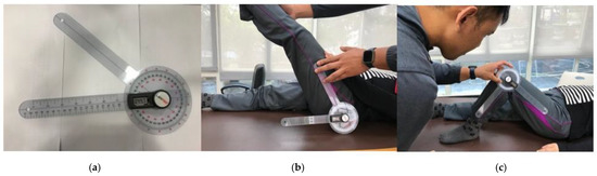 Goniometer and joint angle measurement: (a) goniometer; (b) hip range of motion measurement; (c) knee range of motion measurement.