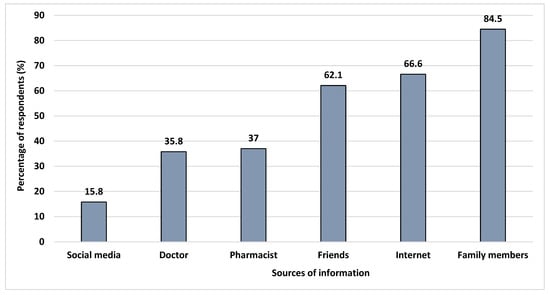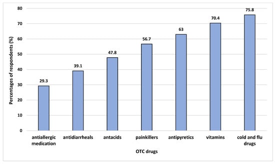 The respondents depend on various sources of information before purchasing suitable OTC medicine, such as family members (84.5%), the Internet (66.6%), friends (62.1%), a pharmacist (37.0%), a doctor (35.8%), and social media (15.8%) (Figure 1). Their reasons for choosing OTC drugs are convenience (84.8%), ability to self-treat (79.7%), time saving (68.4%), low cost (n = 150, 44.8%), and safety (n = 143, 42.7%). The respondents’ favoured OTC drugs were cold and flu drugs (75.8%), vitamins (70.4%), antipyretics (63%), painkillers (56.7%), antacids (47.8%), antidiarrheals (39.1%), and antiallergic medication (29.3%) (Figure 2).