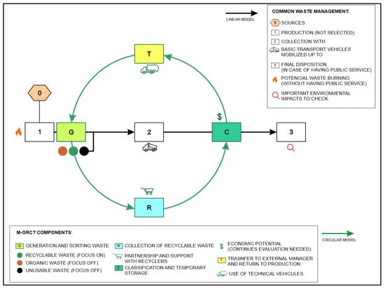 The implementation of a circular approach such as the one considered by the M-GRCT model allows for avoiding the generation of significant negative environmental or economic impacts which are associated with waste management models based on linear economy schemes, in which waste is finally disposed in sanitary landfills and further potential use alternatives are discarded. M-GRCT considers the existence of economic incomes related to (i) specific taxes or rates imposed over the collection and transport of recyclable waste or (ii) the commercialization of recyclable products by external managers. Additionally, the model considers the existence of supervision activities on every managing stage which continuously promotes the system’s improvement.