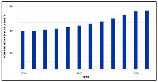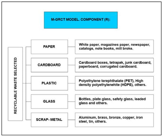 60]. In other words, the definition of simulation scenarios requires establishing the conditions that guarantee its applicability. These conditions depend on the recyclable waste management criteria recorded in Components (G) and (R). The following model projections based in these two previous stored components are obtained by M-GRCT: (i) the existence, use and characteristics of infrastructure, (ii) the recyclable waste collected and stored in final disposal sites and (iii) the availability of machinery for recycling activities.