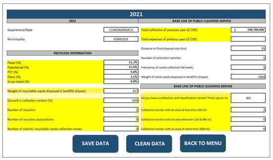 All the information is entered in a second sheet that contains a record with the following data: (i) department, (ii) municipality, (iii) category, (iv) public service provider company, (v) number of recycling stations by area range, (vi) annual recyclable waste and (vii) financial information of the cleaning service company (total collection for the previous year, expenses, administrative payroll, workers payroll, staffing, cost of collection and transportation to final disposal and cost of final disposal).