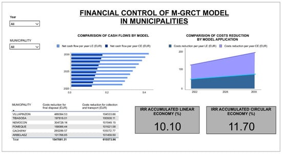 The control dashboard shows the comparison (bar graph) between the value of total income and expenses of waste collection for the linear model and those estimated for every simulated scenario of the circular model. In addition, the control dashboard indicates (using a linear graph) the cost reduction for the implementation of a specific scenario, its economic viability analyzed according to the IRR and the investment return period for its implementation.
