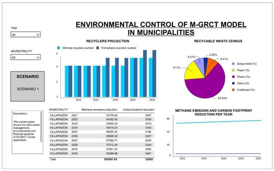 The graphical interface of DATA4 allows for visualizing the results obtained when the model runs. In particular, a set of financial trends, the composition of recyclable waste, the carbon footprint reduction trend and the projection of recyclers joining the process allows the user to identify more strongly the advantages of the M-GRCT model. All the visible variables in the dashboard are compared with the traditional linear model, allowing a practical analysis to promote decision-making to mean the implementation of the model in low-income municipalities. The dashboard is automatically updated with the data entry in the main menu of DATA4.