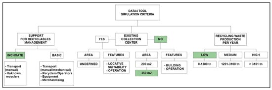 DATA 4 allows the user to analyze two predefined scenarios which were designed to represent the recyclable waste management system of a low-income municipality. These scenarios were designed considering the actual availability of recyclable waste facilities in the municipality.