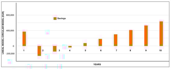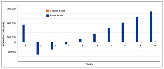 The financial viability of a circular economy model is represented by financial indicators such as the NPV, the internal rate of opportunity (IRO), the IRR and the period of return or payback. NPV is related to the difference between the capital investment in a project and its expenditures; therefore, projects with a positive NPV will be more economically feasible compared to projects with a negative NPV [