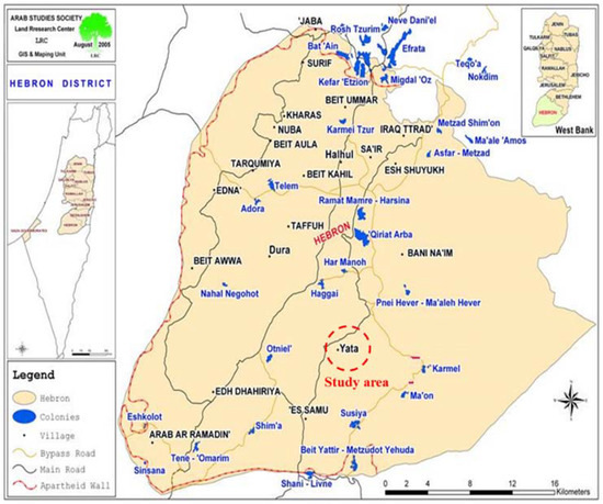 The focus of this research is on Yatta area. Yatta town is approximately 8 km south of the city of Hebron. Hebron is a Palestinian city, located in the southern West Bank, 30 km south of Jerusalem. It lies 930 m above sea level. It is the largest city in the West Bank and the second largest in the Palestinian Territories after Gaza. Hebron is attached to cities of Adh Dhahiriya, Dura, Yatta, and the surrounding villages with no borders. In 2020, its population reached 68,094 capita [28]. Figure 1 shows the Hebron District Map.